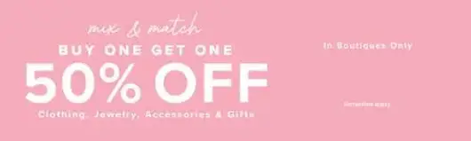 Shop in store and enjoy buy one, get one 50% off clothing, jewelry, accessories & gifts.