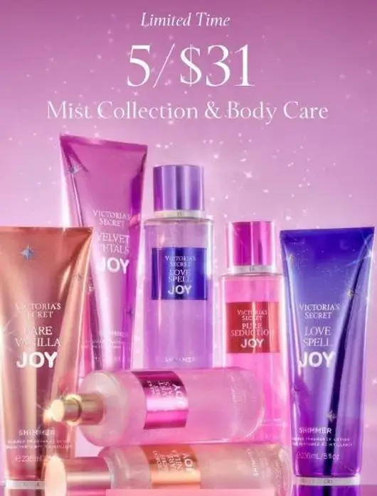 Limited-time savings! Shop in store and get 5 for $31 Mist Collection & Body Care.