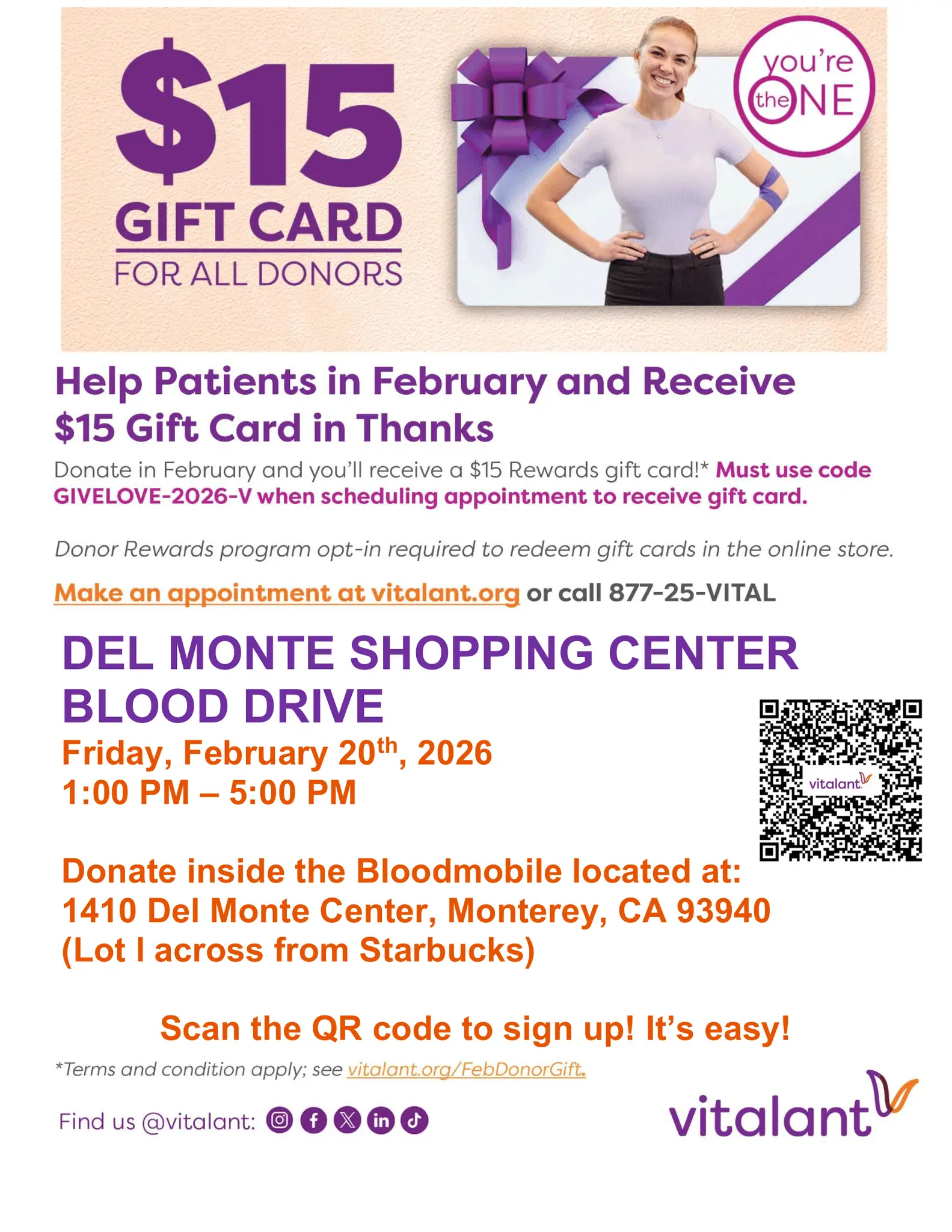 Share donors can get a $15 gift card when you redeem the code: GIVELOVE-2026-V.